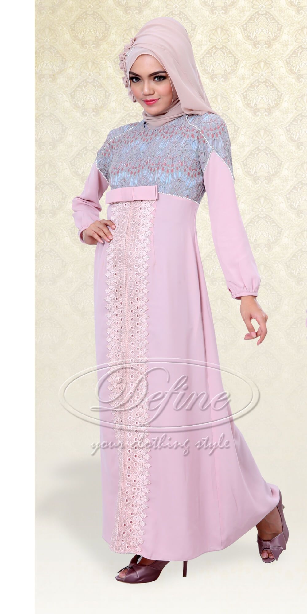 Dress berwarna pink yang dikombinasikan dengan brokat berwarna putih ini didesain denga model long dress, di bagian luar ditambahkan dengan kain berwarna pink yang dikaitkan di bawah leher menggunakan aksesoris seperti bross. Dipadukan dengan jilbab yang mengkombinasikan warna pink dan warna abu-abu dengan bentuk seperti hijabers.