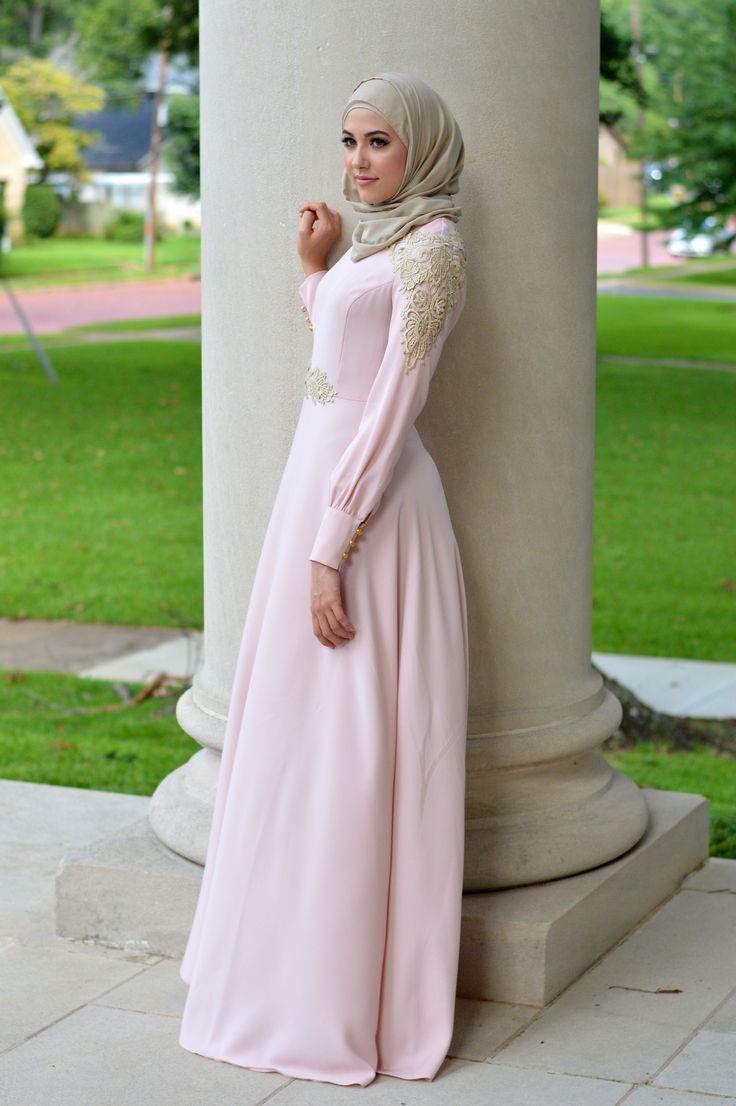 Dress yang satu ini juga cocok dipakai untuk acara pesta. Di desain dengan sangat simple yang dikombinasikan dengan brokat panjang hingga kaki. Di bagian perut diberi aksesoris sedikit yang menambah kecantikan pada dress ini. Dress berwarna kalem ini bisa dipadukan dengan jilbab berwarna senada yang polos.