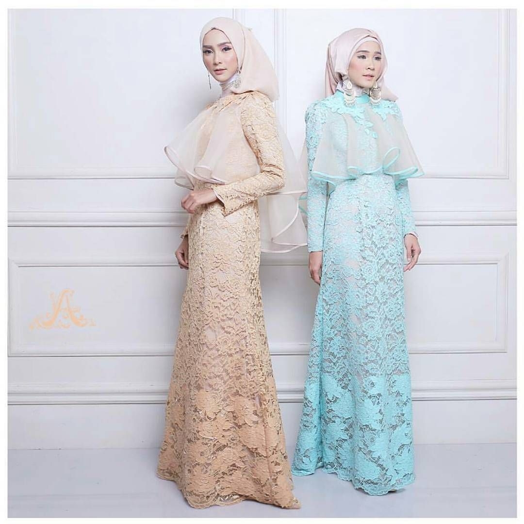 Dress untuk pesta ini sangat cantik. Didesain dengan full brokat berwarna cream dan hijau tosca. Dua warna yang sering dipakai untuk membuat dress. Modelnya pun anggun, ditambahkan dengan kain transparan yang cantik yang diberikan di bagian depan dan belakang. Dipadukan dengan jilbab berwarna cream yang dipakai ala hijabers sangat manis.