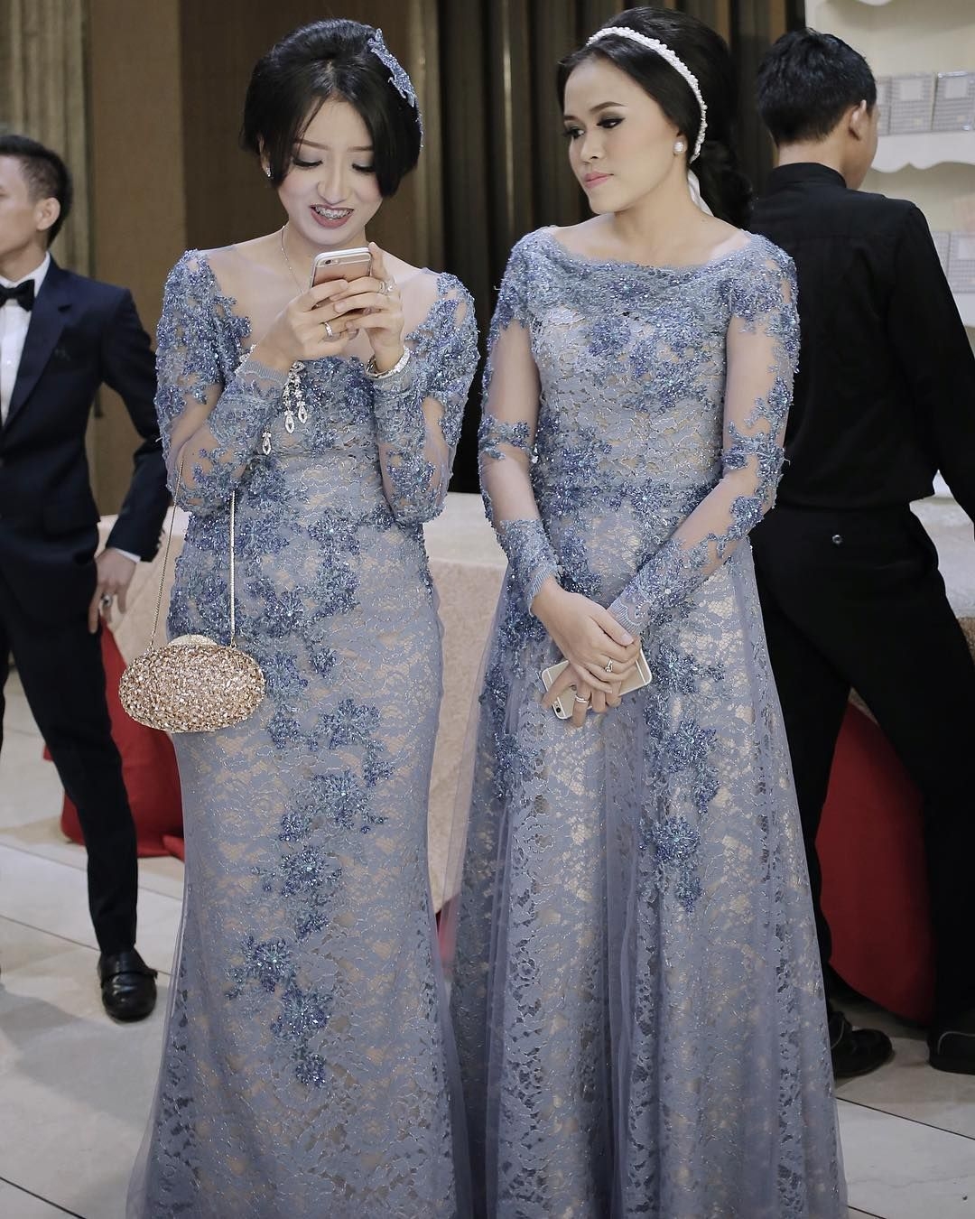 Gaun berwarna abu-abu biru ini sangat terlihat elegant. Perpaduan warna yang kalem ini didesain dengan sangat cantik. Bisa dibuat dengan model press body seperti sebelah kiri, atau bisa juga dibuat seperti model gaun pada umumnya yang mekar di bagian perut ke bawah. Gaun ini sangat cantik dipakai untuk acara pesta.