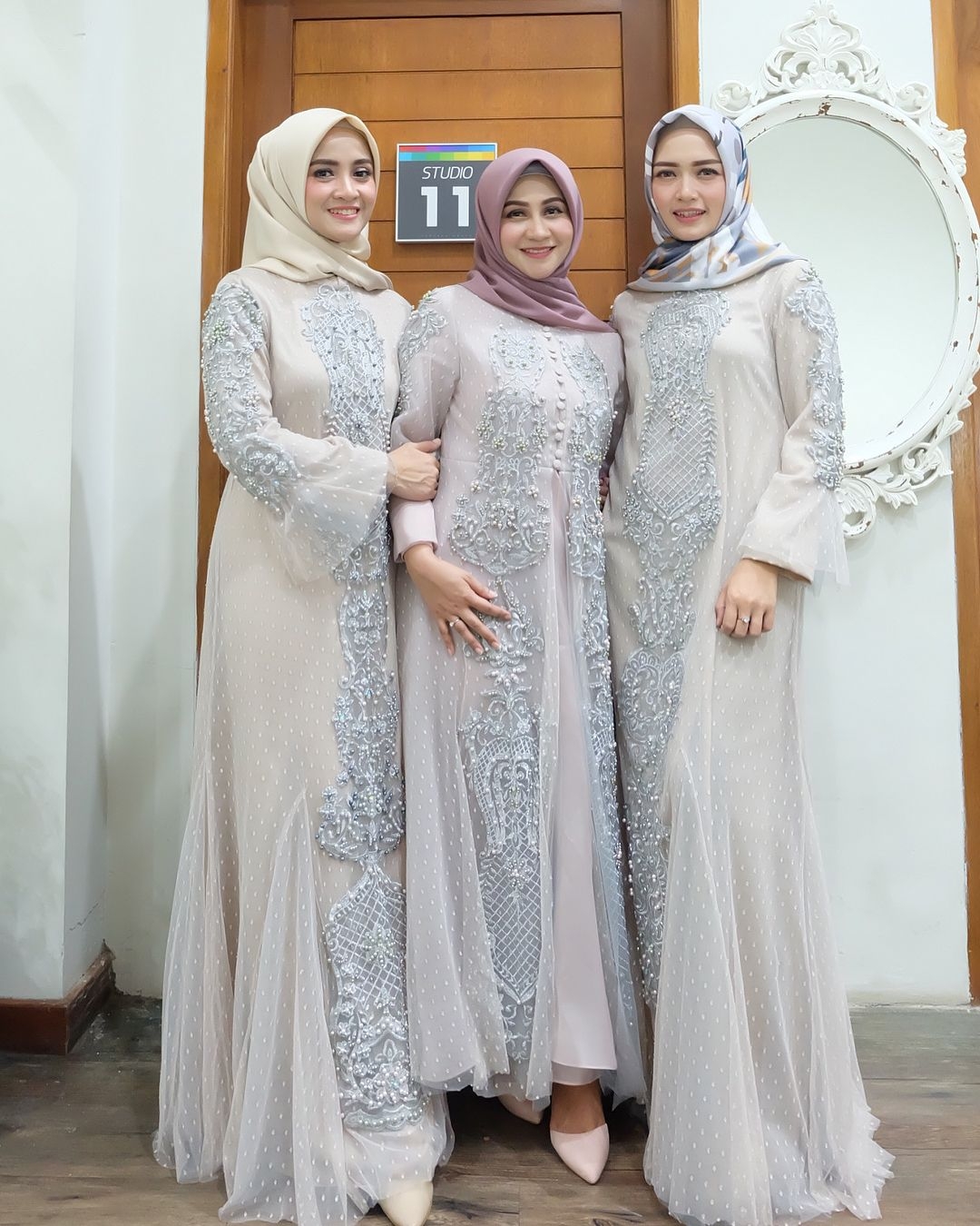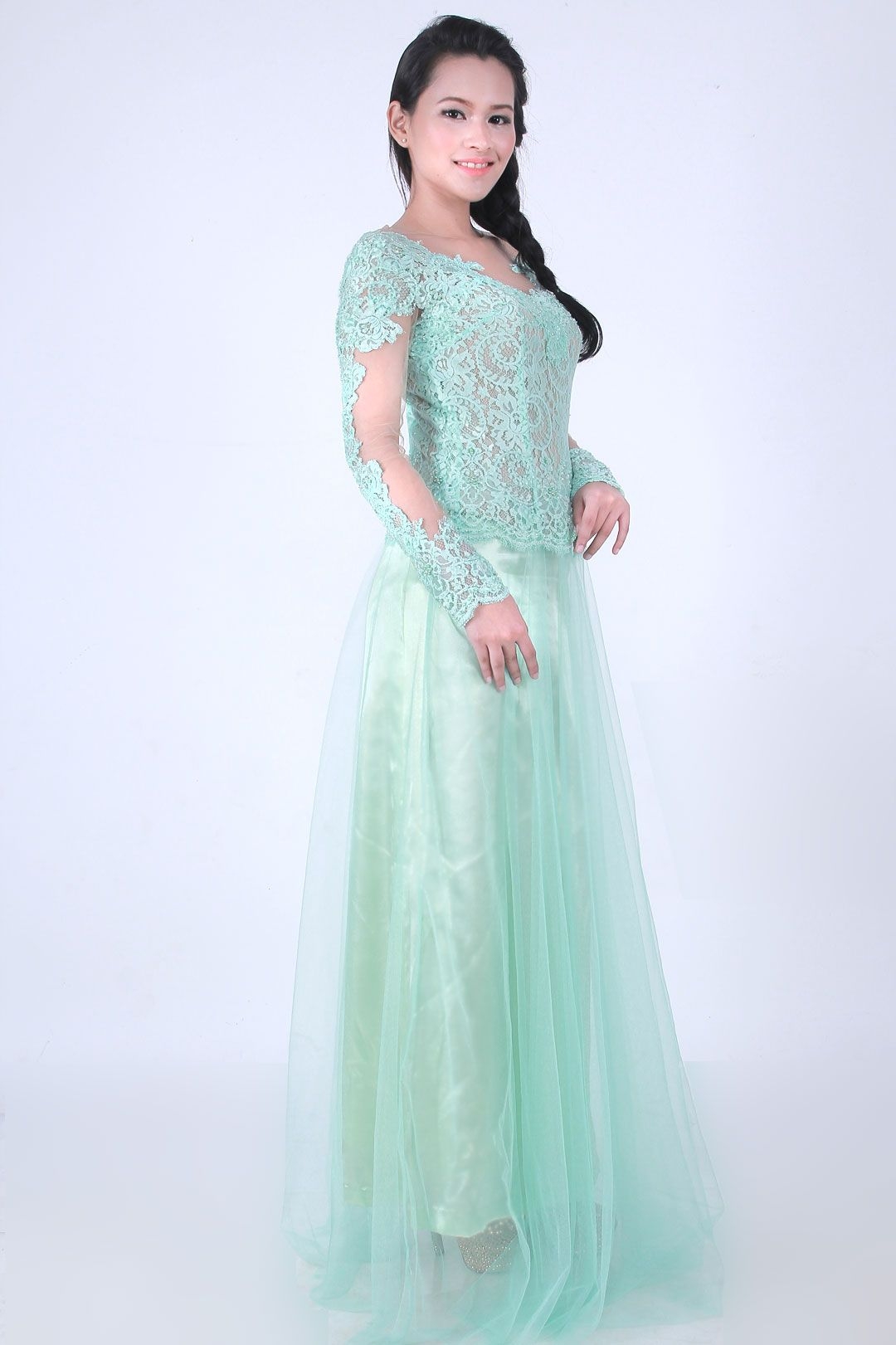 Warna hijau tosca adalah salah satu warna favorit yang biasa digunakan untuk warna gaun, seperti pada gaun ini. Dengan atasan brokat berwarna hijau tosca, bawahan seperti rok yang mekar layaknya gaun pada umumnya. Gaun hijau tosca seperti ini bisa dipadukan dengan jilbab berwarna hijau tosca atau abu-abu.