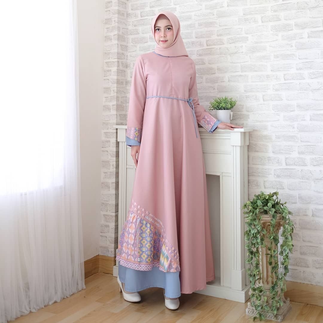 Dress ini memadukan warna abu-abu dengan pink dengan cantik. Bunga-bunga warna pink diberikan di bagian depan dari atas hingga bawah. Di bagian depan terdapat kancing hingga perut, kemudian bagian bawahnya diberi belahan. Selain pada bagian depan, motif bunga juga diberikan di bagian tangan. Dipadukan dengan jilbab pashmina warna pink, cocok untuk dipakai ke acara kondangan maupun pengajian.