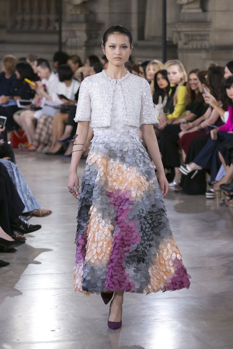 Cantik sekali gaun yang satu ini. Warna putih yang dipadukan dengan warna warni seperti pelangi ini sangat lucu. Apalagi bahan yang digunakan unik seperti sisik. Hanya saja bagian atasan dibuat seperti cardigan dengan manik-manik yang mewah dan tebal. Ini memberikan kesan mewah pada gaun ini.