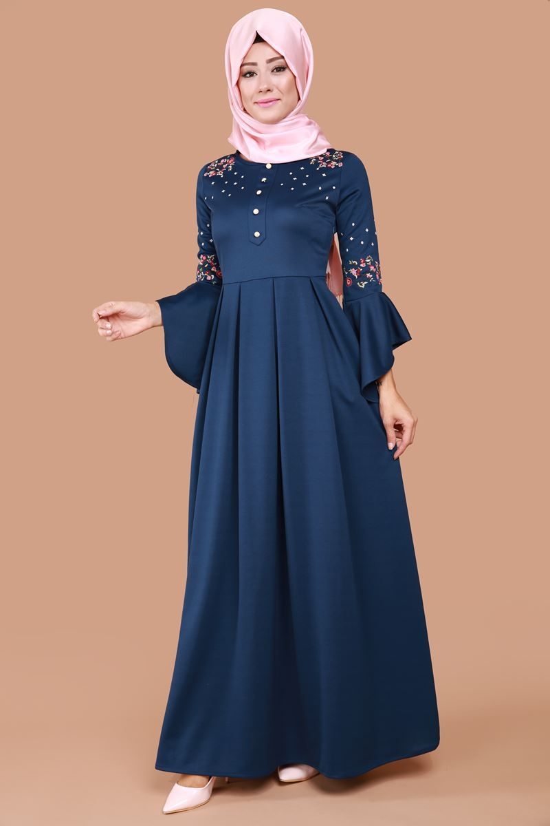 Gamis cantik berwarna navy ini juga bisa dipakai untuk ke acara kondangan. Gamis cantik dengan kancing di bagian atas. Di tambahkan dengan sedikit aksesoris dan bunga-bunga menjadikan gaun ini menjadi lebih cantik. Dipadukan dengan jilbab pashmina berwarna pink. Perpaduan yang cocok.
