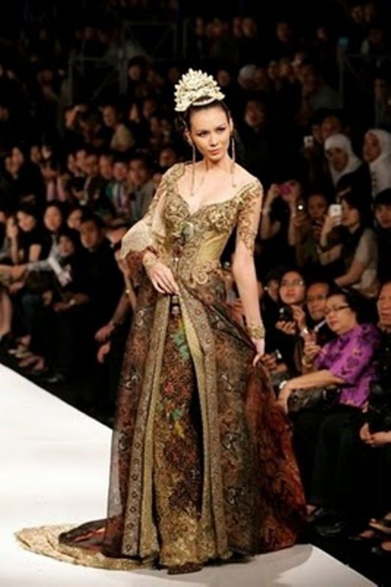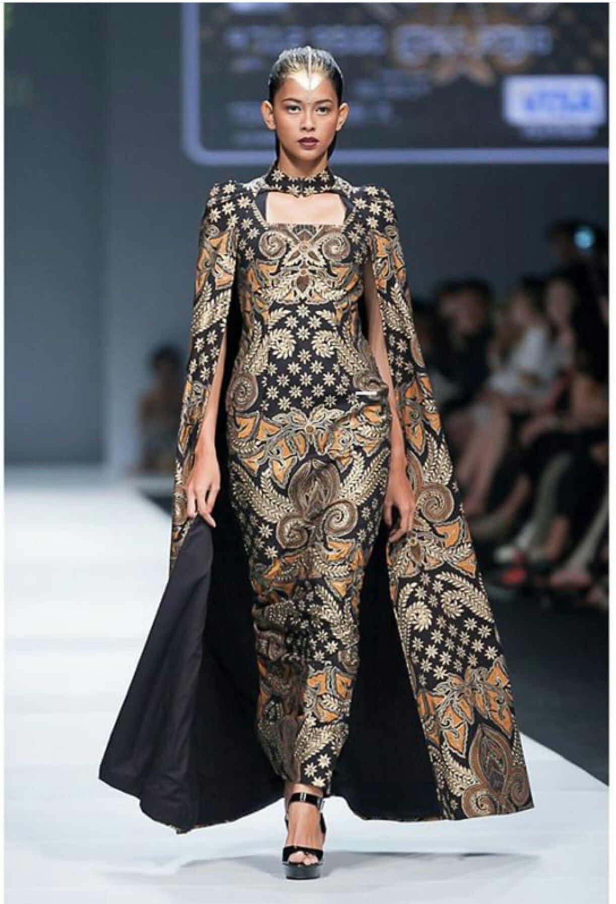 Gaun fashion show yang bertemakan batik ini terlihat elegant. Didesain dengan model baju panjang yang membentuk tubuh dan di bagian belakang ditambahkan dengan jubah panjang berbahan dan bermotif yang sama. Tidak perlu banyak memakai aksesoris karena gaun ini memberikan kesan berani.
