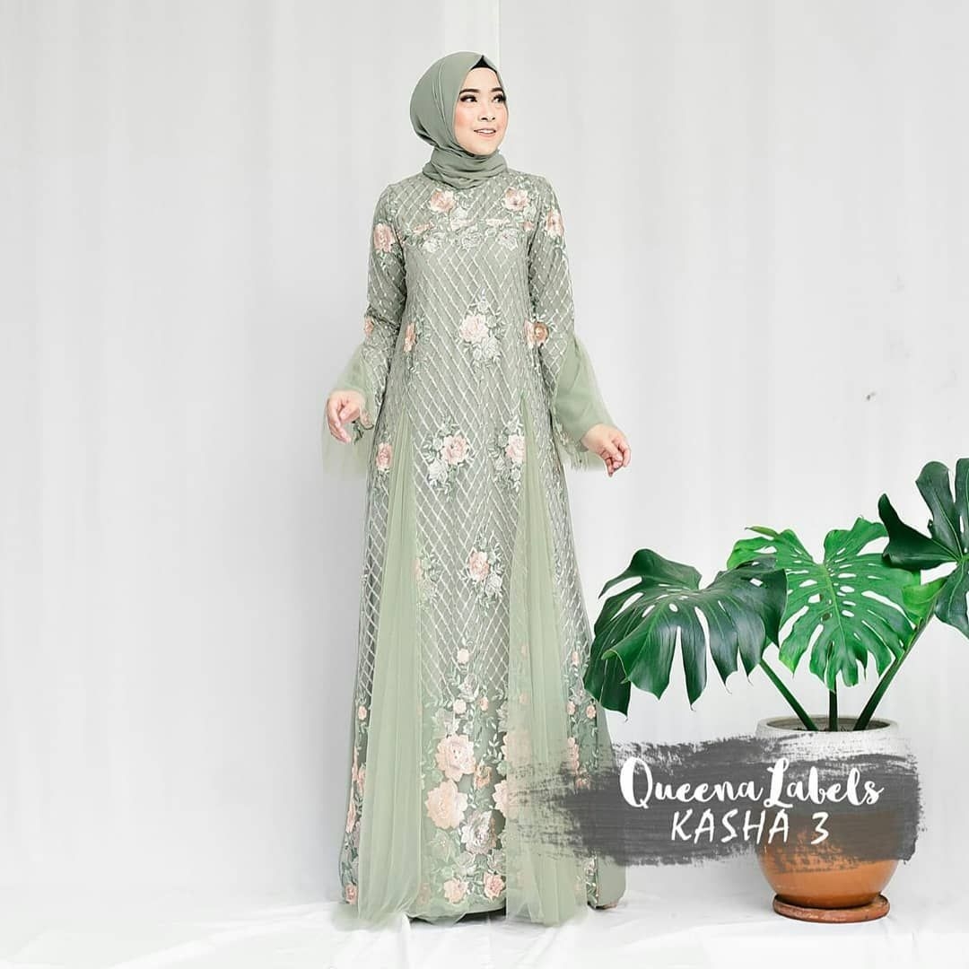 Gaun cantik berwarna hijau ini terlihat simple tetapi elegant. Dikombinasikan dengan brokat jaring-jaring dan bunga mawar berwarna cream. Perpaduan yang sangat manis sekali. Di bagian depan terdapat dua belahan yang memperlihatkan warna hijau polos. Di bagian lengan juga terdapat belahan. Jilbab yang dipakai segi empat yang berwarna senada dengan gaun.