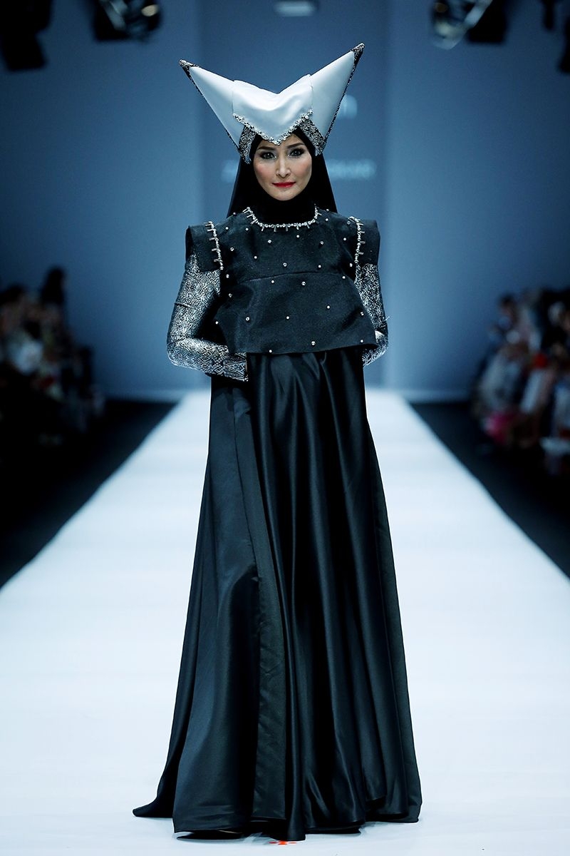 Gaun ini memang cocok untuk acara fashion show. Pemilihan warna hijau tua dengan bahan yang mengkilat memberikan kesan mewah pada gaun ini, ditambah dengan aksesoris di bagian atas dan kantong di bagian depan. Di bagian tangan dibuat dengan bahan yang berbeda, bermotif warna hijau lebih muda. Jilbab yang dipilih pun berwarna gelap dan ditambahkan dengan hiasan kepala.