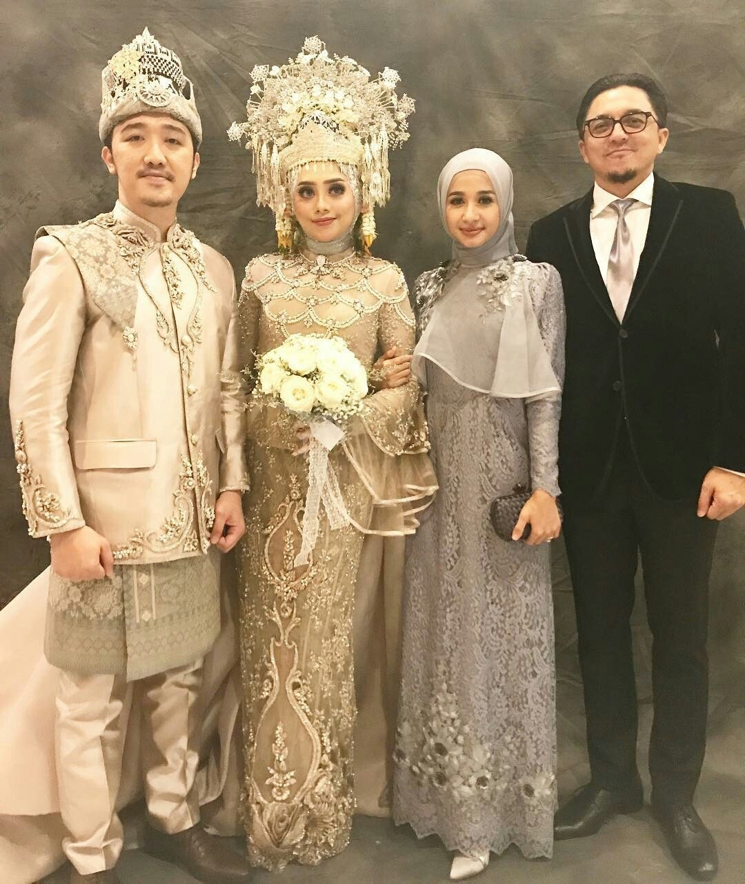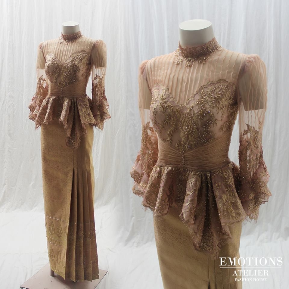 Ini bisa dijadikan sebagai referensi gaun untuk pernikahan. Gaun pernikahan berwarna cream kecokelatan ini sangat cantik. Seperti memakai adat tertentu, di bagian atas kepala diberikan seperti mahkota dengan warna yang senada. Pakaian untuk pengantin pria juga dengan warna senada dan memakai seperti sarung pendek yang panjangnya sampai lutut.