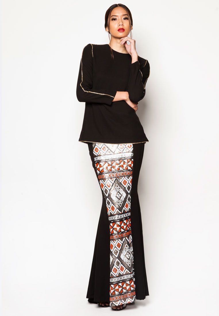Warna hitam memang cocok dipadukan dengan warna apapun, seperti outfit kondangan yang satu ini. Outfit kondangan berwarna hitam ini sangat terlihat simple. Meski dengan atasan dan bawahan terpisah, outfit ini tetap terlihat elegant. Atasan yang dipilih berwarna hitam polos dengan sedikit garis di pinggirnya. Bagian bawah dibuat seperti rok biasa ketat membentuk tubuh, berwarna hitam polos yang dikombinasikan dengan songket bermotif sangat cantik.