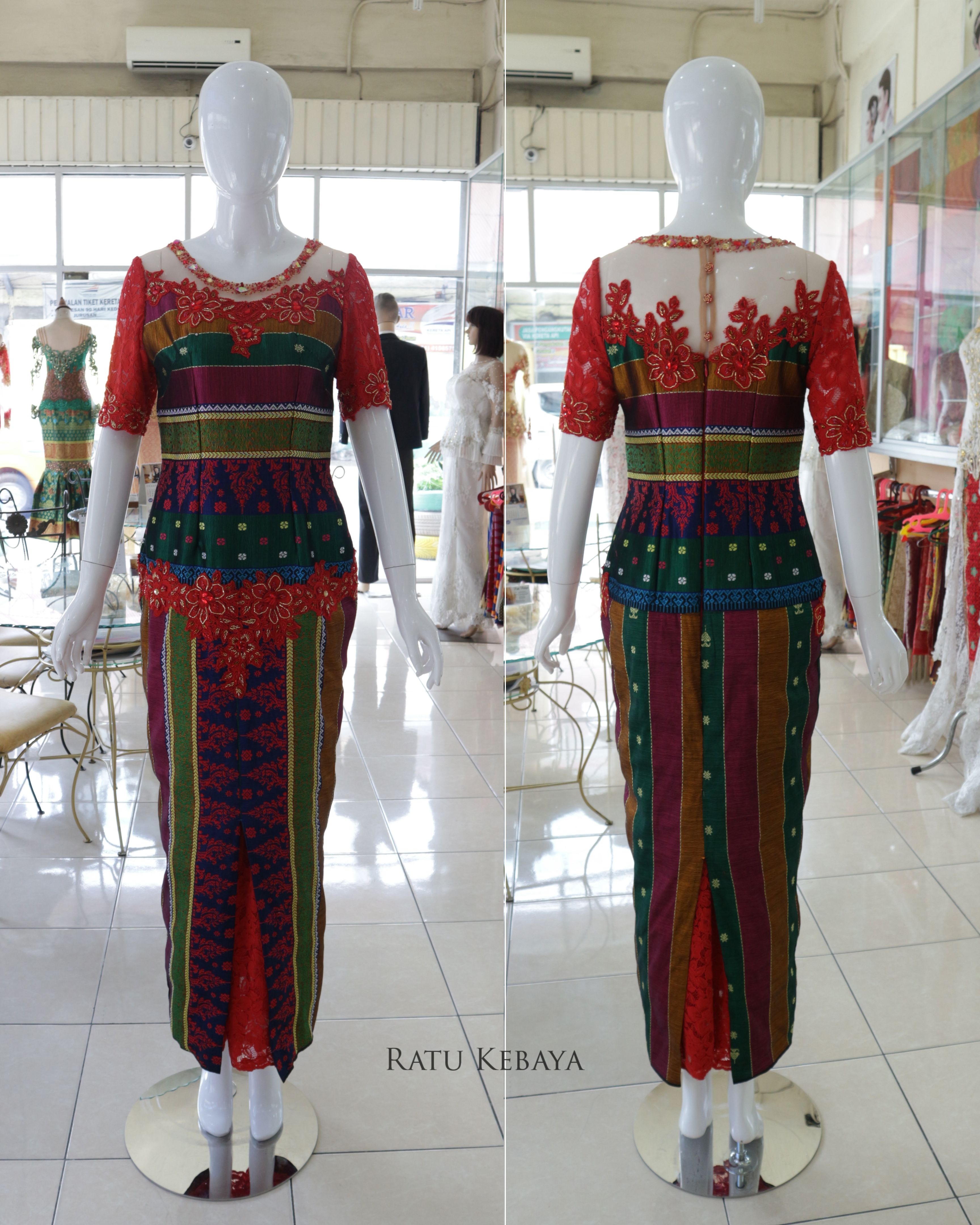 Outfit kondangan yang satu ini terlihat begitu ceria dengan perpaduan warna-warni. Atasan dan bawahan dibuat dengan model yang terpisah. Motif dari outfit ini juga berkesinambungan. Atasan dengan motif bergaris-garis horizontal, sedangkan bawahan dengan motif garis-garis vertikal dengan warna yang sama dengan atasan.