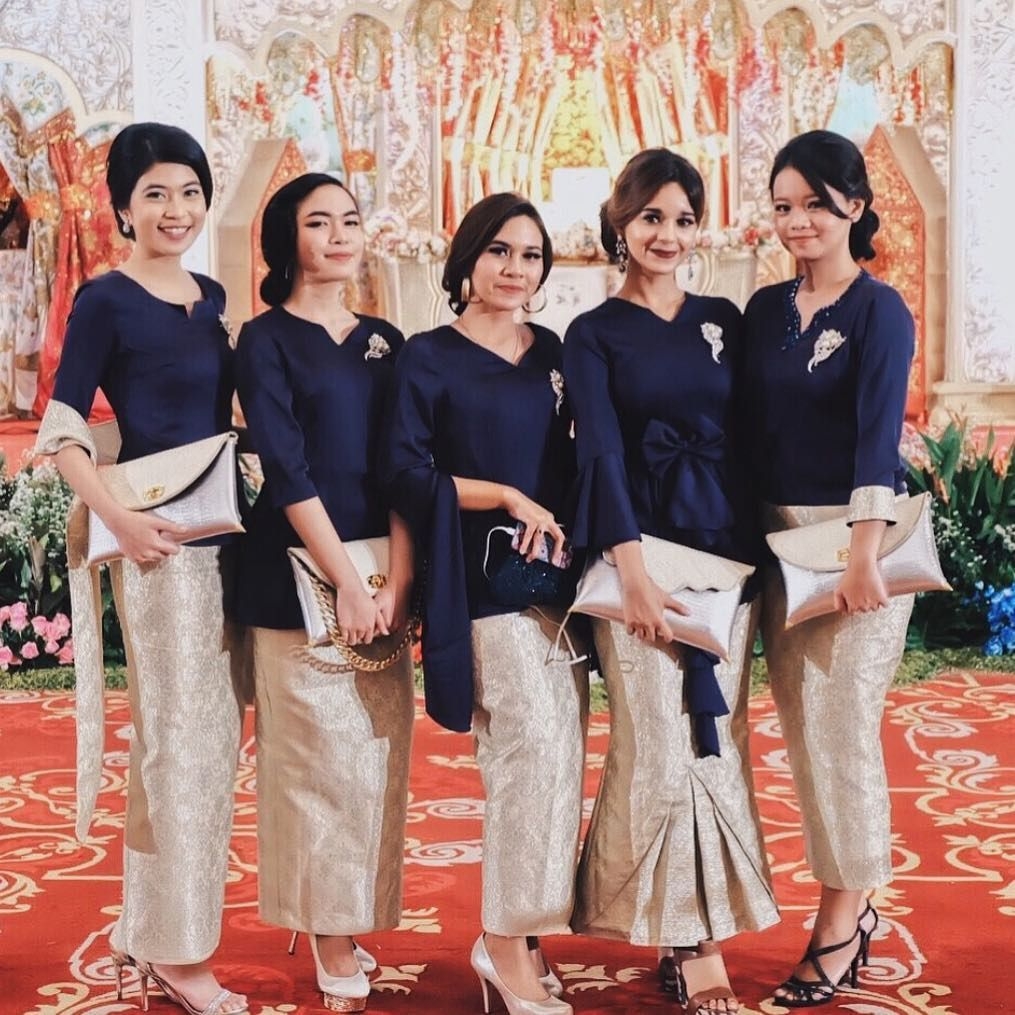 Ada inspirasi untuk kondangan yang bisa djadikan untuk seragam, seperti seragam kondangan ini. Perpaduan antara warna navy dan cream ini sangat manis. Atasan didesain dengan model yang simple dan polos, sedangkan bawahannya bermotif tetapi dengan warna yang sama sehingga tidak terlalu terlihat motifnya.