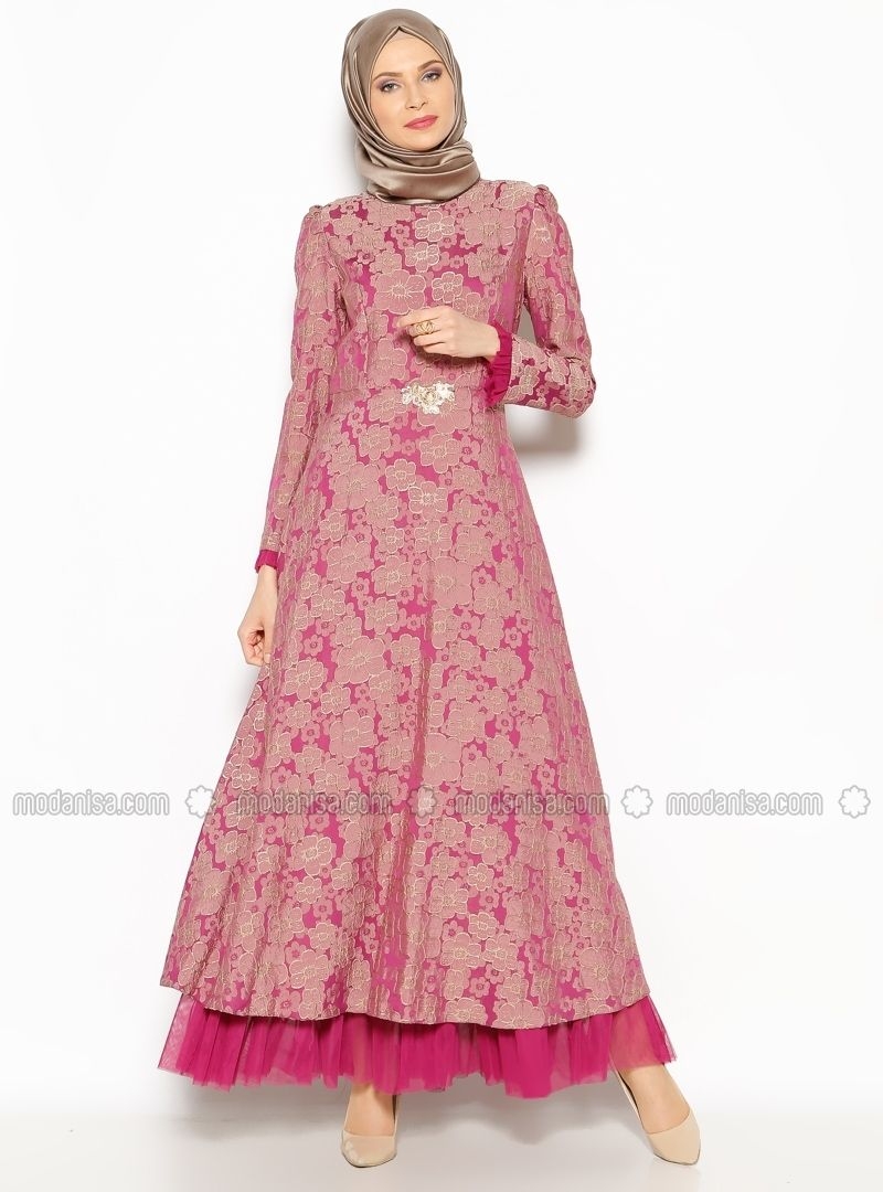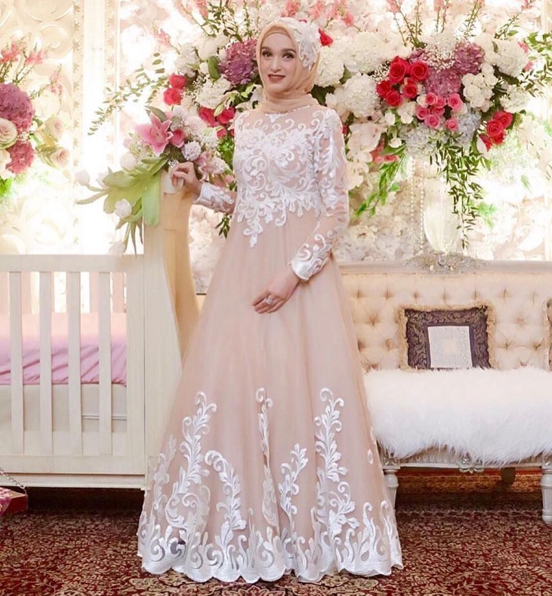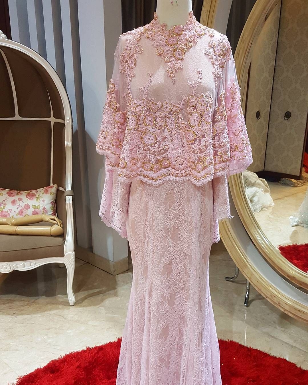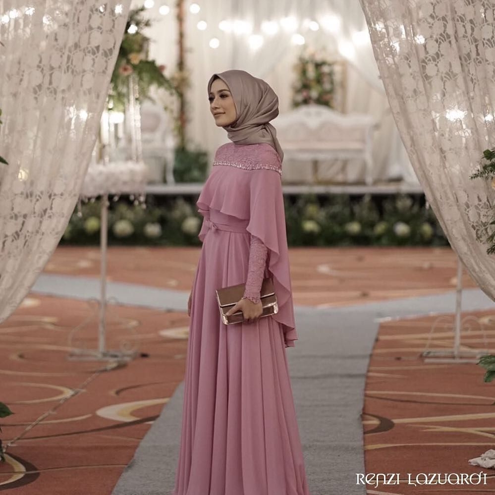 Model gaun berwarna pink ini memang terlihat simple, namun juga terkesan mewah. Dengan dikombinasikan brokat berwarna keemasan di bagian atas dan pergelangan tangan membuat gaun ini terlihat cantik. Jilbab yang dipakai berwarna peach yang cocok dengan warna brokat.