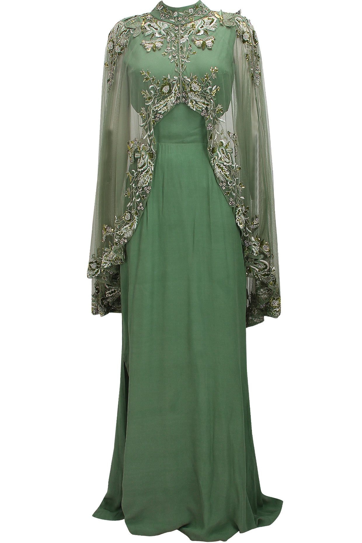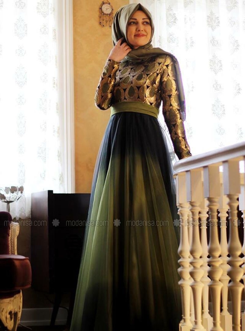 Gaun berwarna hijau yang dikombinasikan dengan brokat berwarna abu agak kehijau-hijauan ini cocok dipakai untuk menghadiri pesta. Hanya tinggal memadukan dengan jilbab berwarna hijau atau berwarna abu-abu. Tidak perlu menambahkan aksesoris lain. Penampilanmu akan terkesan cantik.