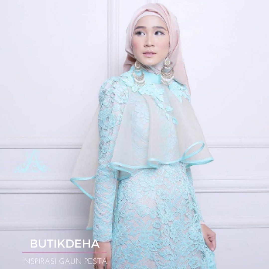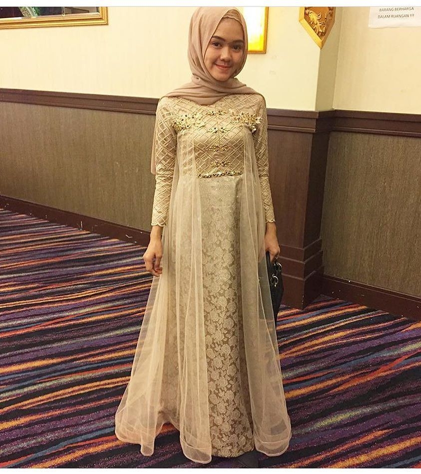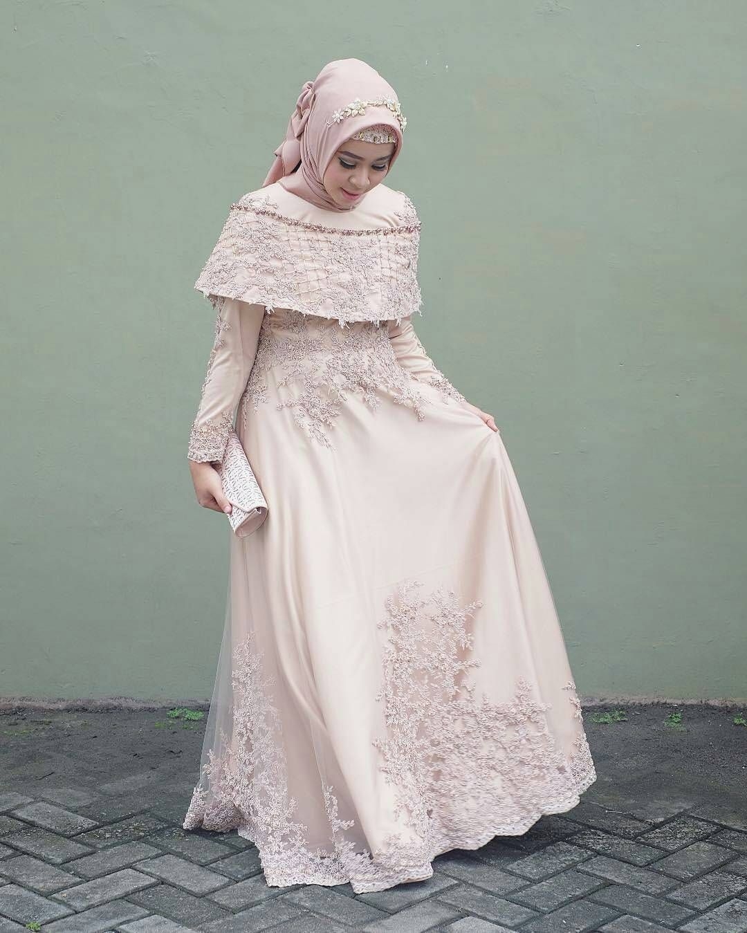 Gaun pesta yang satu ini sangat cantik dan elegant. Dengan pemilihan warna yang soft dan dikombinasikan dengan brokat berwarna senada menjadikan gaun ini semakin terlihat elegant. Tidak perlu menambahkan banyak aksesoris. Pemakaian jilbab juga dengan warna senada yang bagian kepala diberi sedikit aksesoris yang melingkar ke bawah.