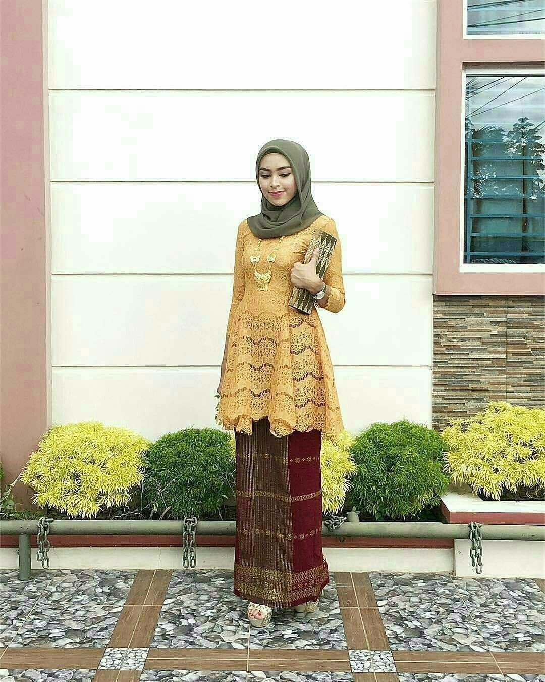 Outfit kondangan seperti ini mungkin lebih sering ditemui. Dengan memadukan atasan berwarna kuning dan bawahan berwarna merah maroon bermotif. Kebaya didesain biasa yang memiliki panjang hingga atas lutut. Ditambah dengan sedikit aksesoris berupa kalung berwarna keemasan. Jilbab yang dipakai segi empat berwarna hijau.