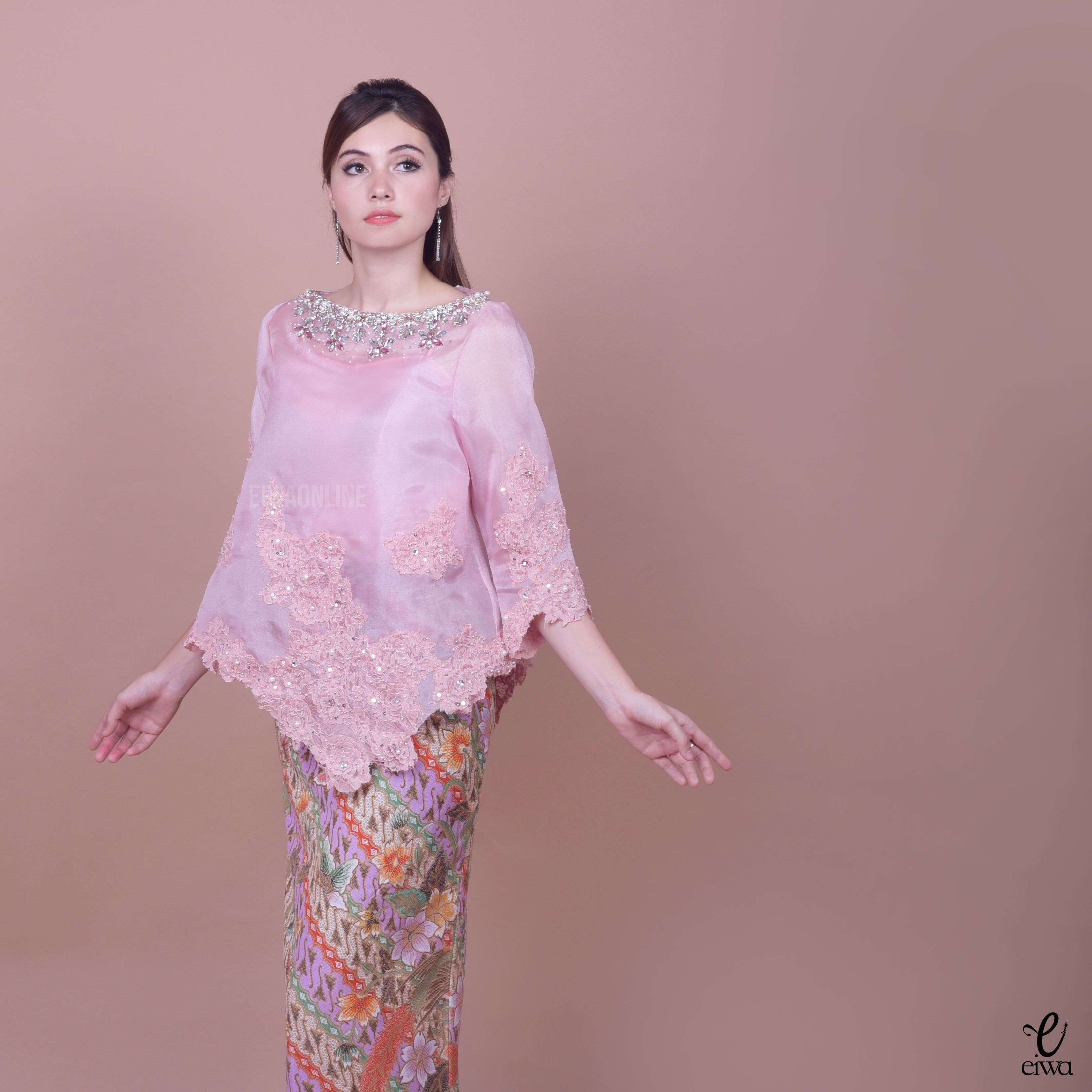Kebaya memang bisa dibuat dengan model apapun, termasuk model bentuk V seperti ini. Jika biasanya bentuk V dibuat pada bagian kerah, kalau ini di bagian bawah. Dengan pemilihan warna pink yang sangat cantik dan sedikit sentuhan brokat. Dipadukan dengan bawahan bermotif bunga-bunga dan berwarna-warni dominan pink ungu ini sangatlah serasi.