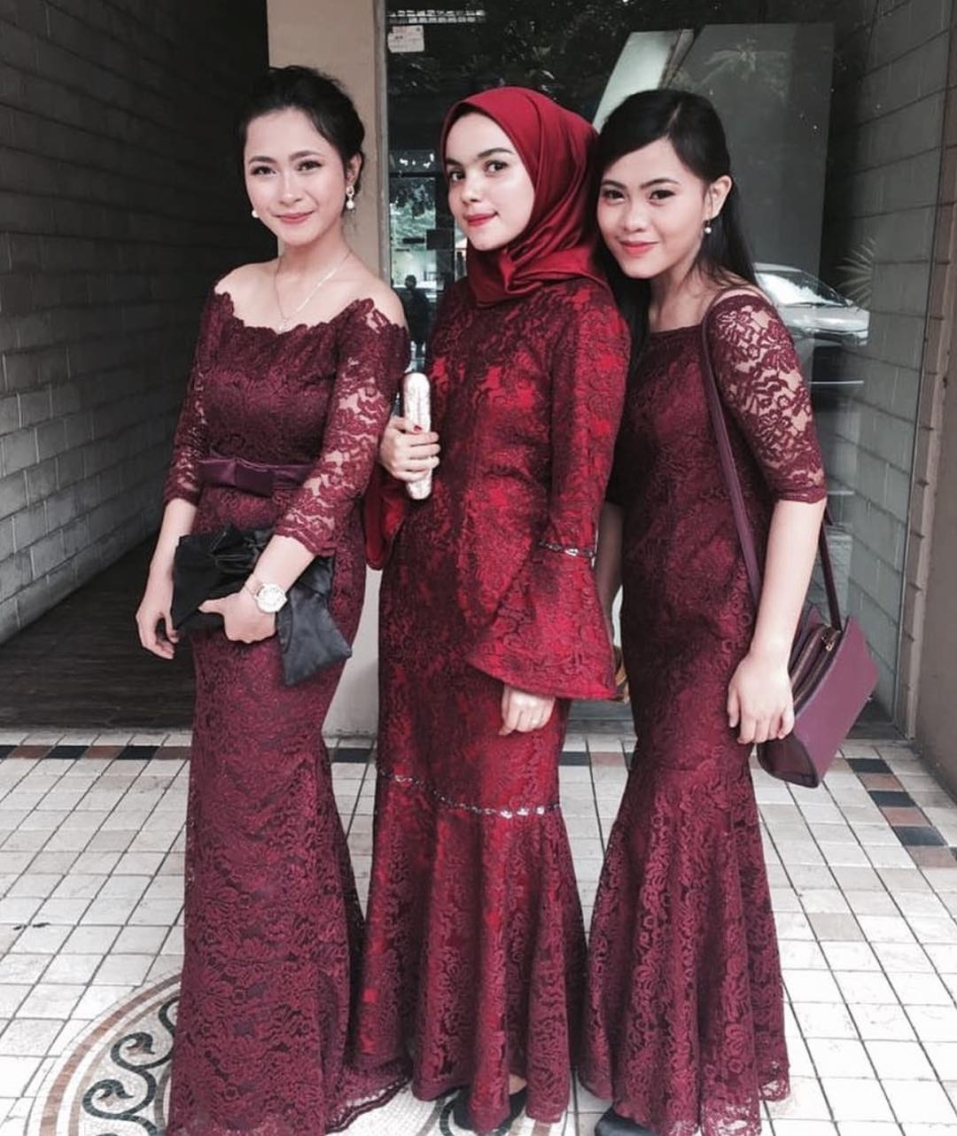 Seragam untuk bridesmaid dengan brokat warna merah maroon ini terlihat begitu elegant. Dibuat dengan model yang berbeda-beda tak mengurangi kecanatikan dari kebaya ini. Warna merah maroon seperti ini lebih cocok dipakai untuk wanita berkulit terang. Tidak perlu banyak menambah aksesoris. Penampilan seperti ini sudah cantik untuk pergi ke kondangan.