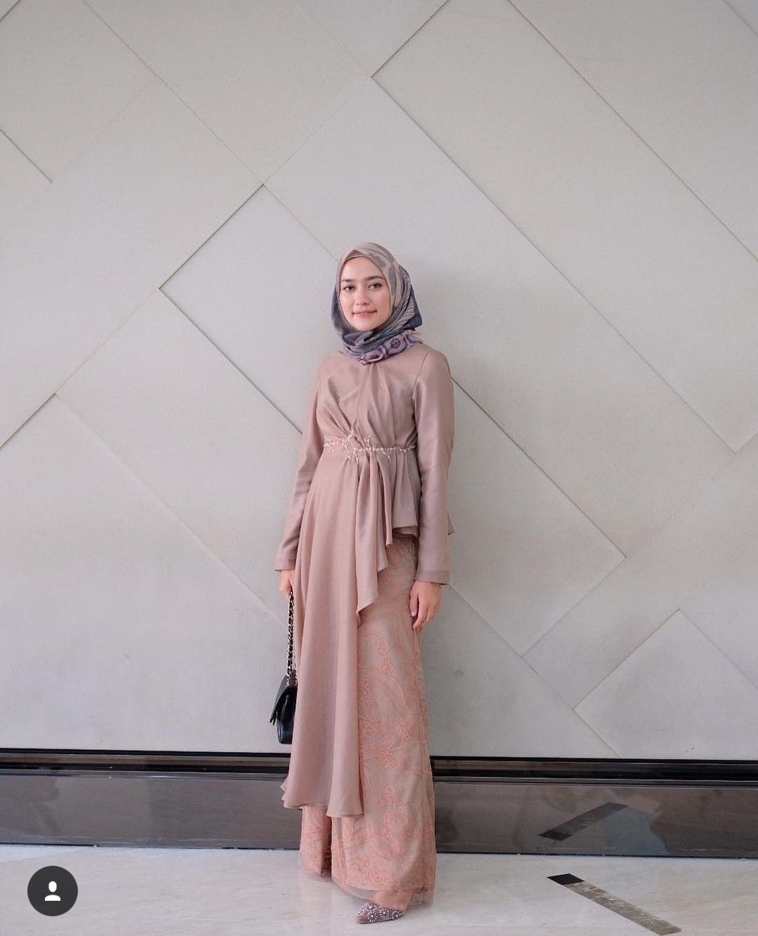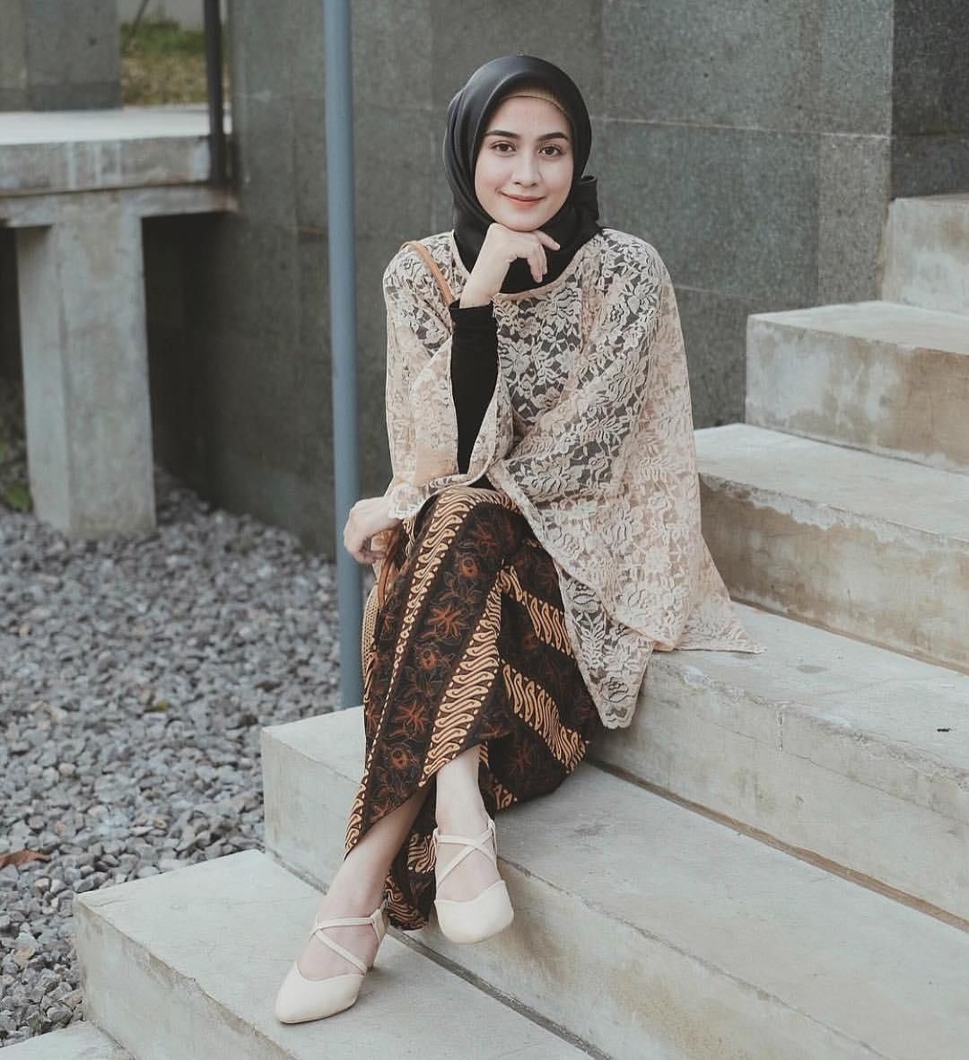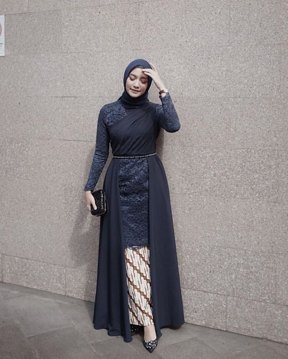 Outfit kondangan satu ini juga bisa dijadikan sebagai referensi terutama untuk anak muda. Dengan memeadukan brokat berwarna navy, kain polos berwarna navy, dan bawahan batik berwarna putih cokelat. Di bagian perut terdapat seperti tali yang melingkar. Jilbab yang dipakai juga berwarna navy. Outfit kondangan ini sangat cantik sekali.