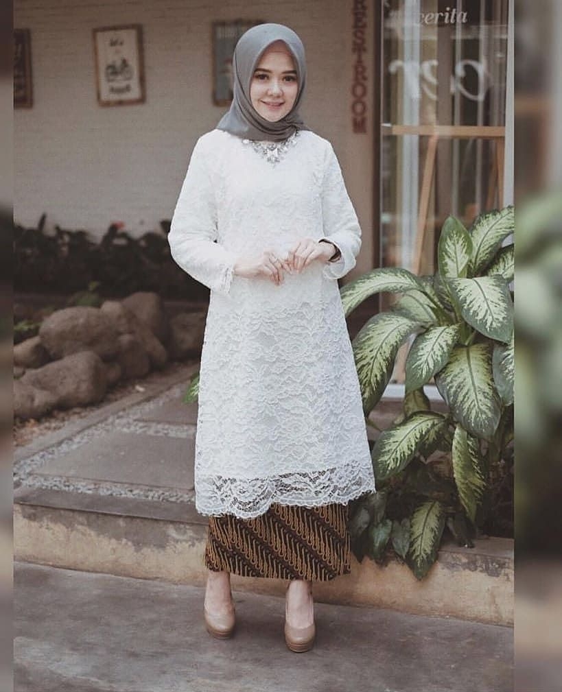Warna putih memang lebih mudah untuk dipadukan dengan warna apapun, seperti kebaya brokat putih ini. Didesain dengan sangat simple, di bagian bawah leher diberikan sedikit sentuhan aksesoris bewarna abu-abu dan putih. Dipadukan dengan bawahan batik berwara cokelat dan jilbab berwarna abu-abu. Outfit kondangan seperti ini terkesan anggun dan cantik.
