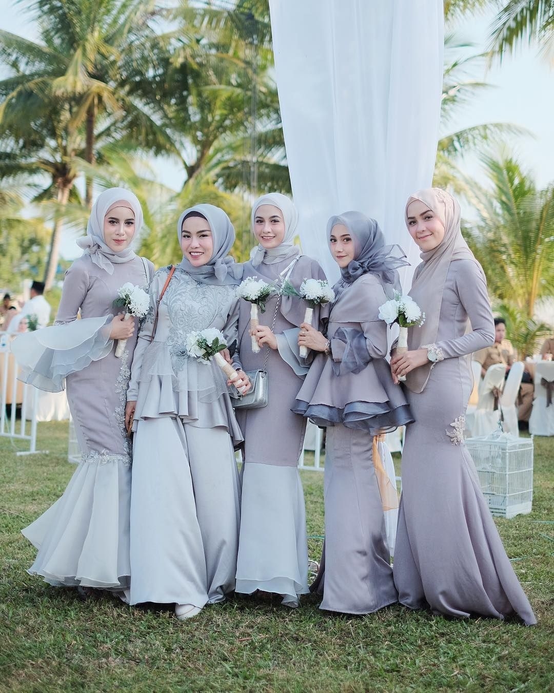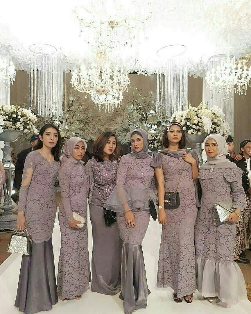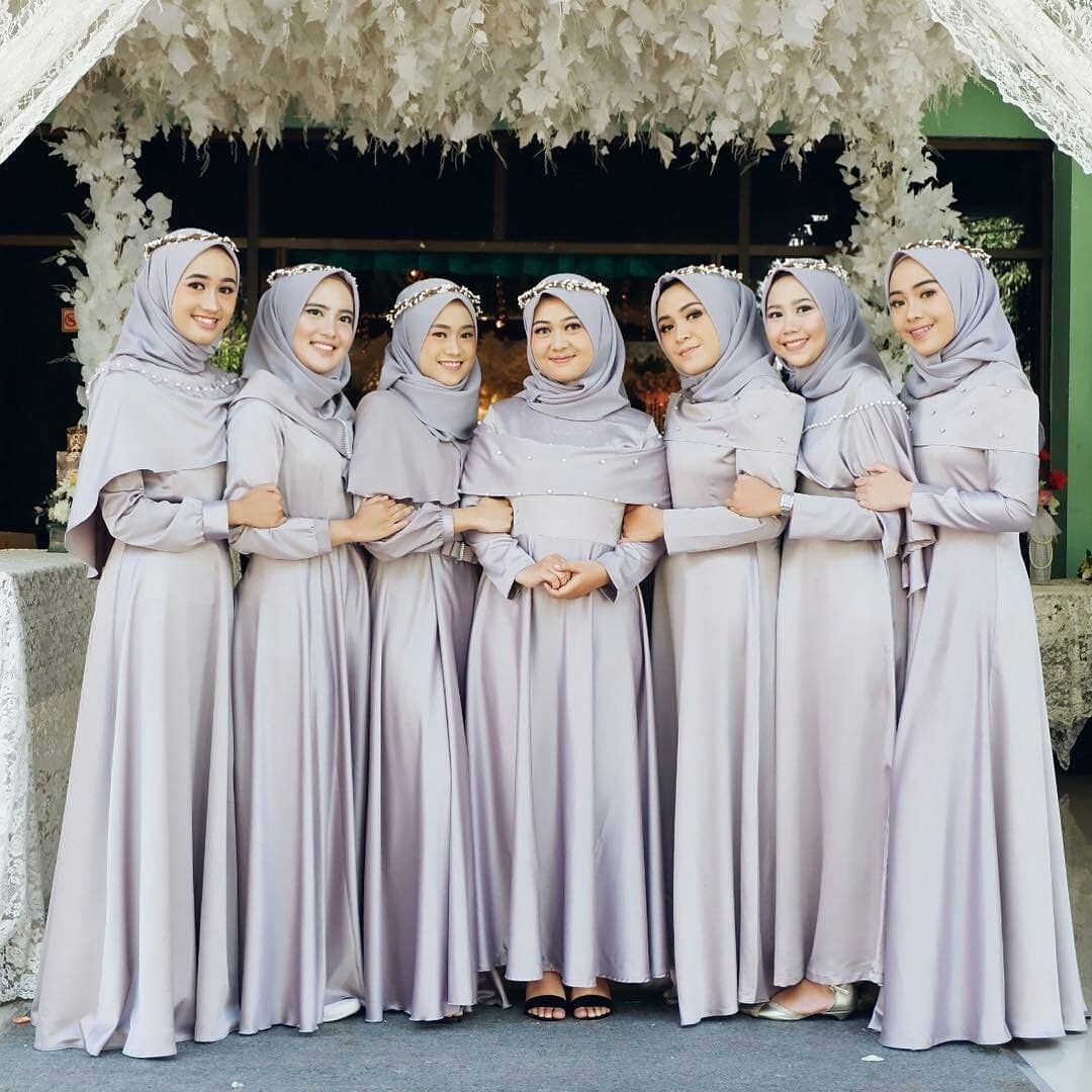 Ada lagi rekomendasi dress untuk bridesmaid yaitu perpaduan antara warna abu-abu dan ungu yang sangat manis sekali. Ada lima model baju yang bisa kamu pilih. Semua didesain dengan sangat cantik dan elegant. Hanya dengan dipadukan bersama jilbab warna yang senada. Cocok untuk datang ke acara pesta outdoor maupun indoor.