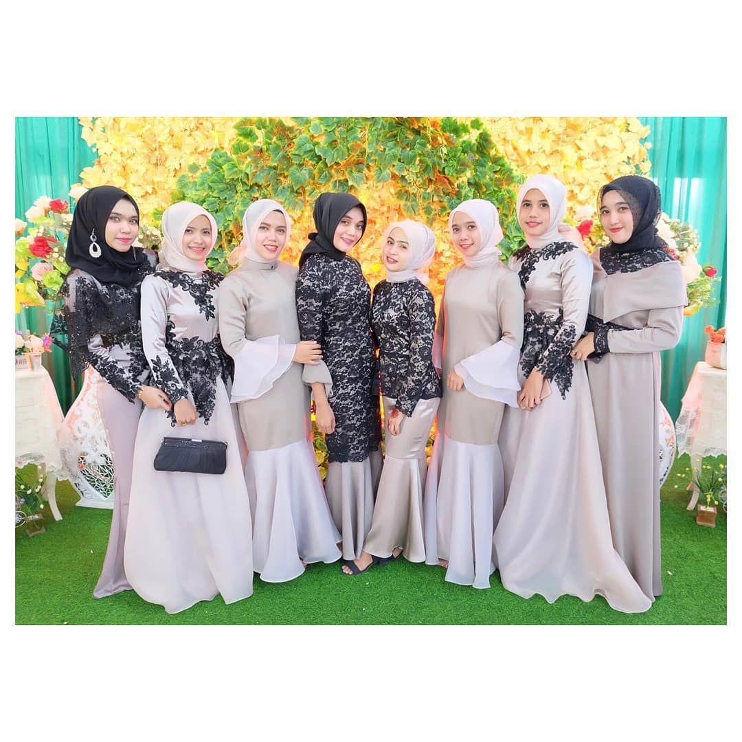 Gaun satu ini terlihat sangat elegant. Dengan pilihan warna yang kalem dan dikombinasikan dengan brokat warna senada dan sedikit aksesoris membuat kesan mewah dalam gaun ini. Bahan yang dipilih pun juga terlihat mengkilat layaknya gaun pesta mewah yang lain. Gaun pesta elegant ini bisa dipadukan dengan jilbab yang warnanya senada. Cocok banget kamu pakai untuk datang ke acara pesta.