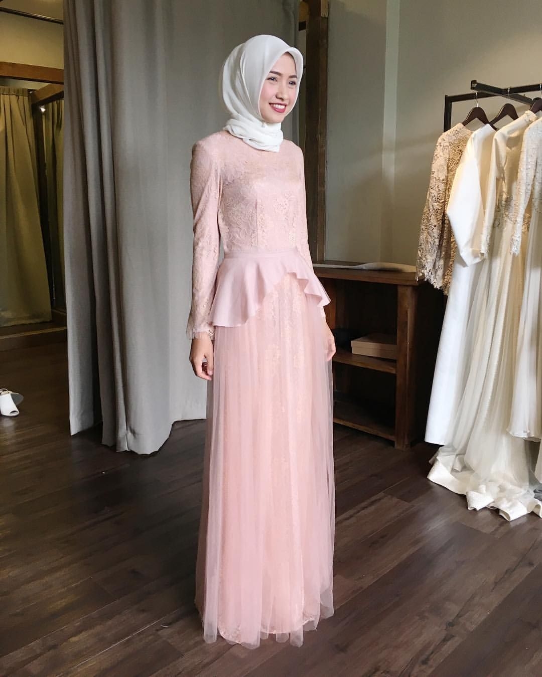 Ini salah satu gaun yang memadukan warna favorit. Gaun berwarna pink dengan kombinasi brokat berwarna cream. Brokat yang dipakai hanya di bagian atas Bagian pergelangan tangan dibuat lebih kecil. Jilbab yang dipilih berwarna senada dengan warna brokat yaitu warna cream. Penampilan yang terlihat sangat anggun.