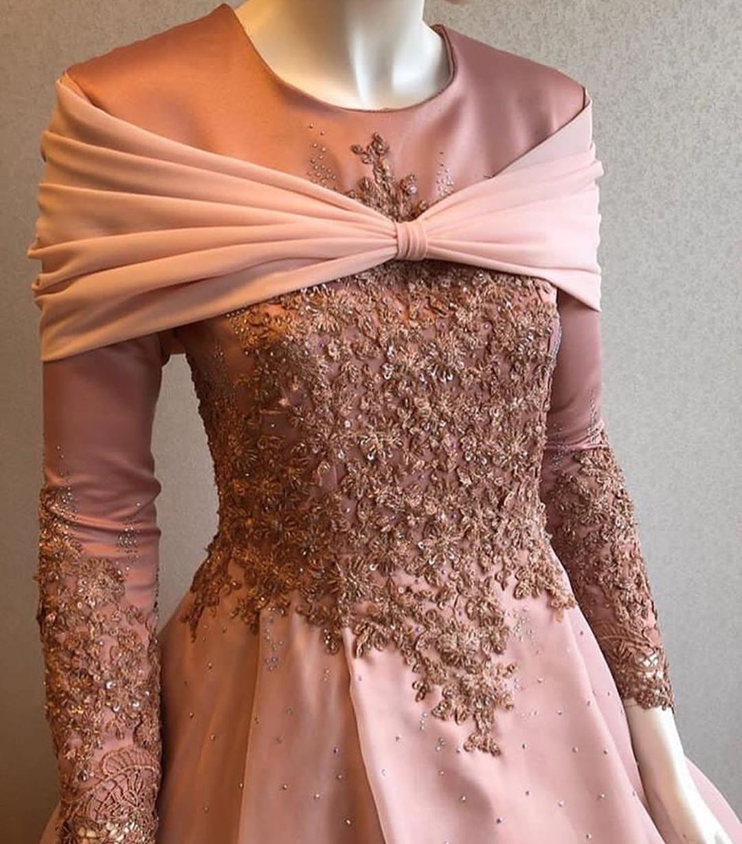Gaun dusty pink dengan kerutan di tangan