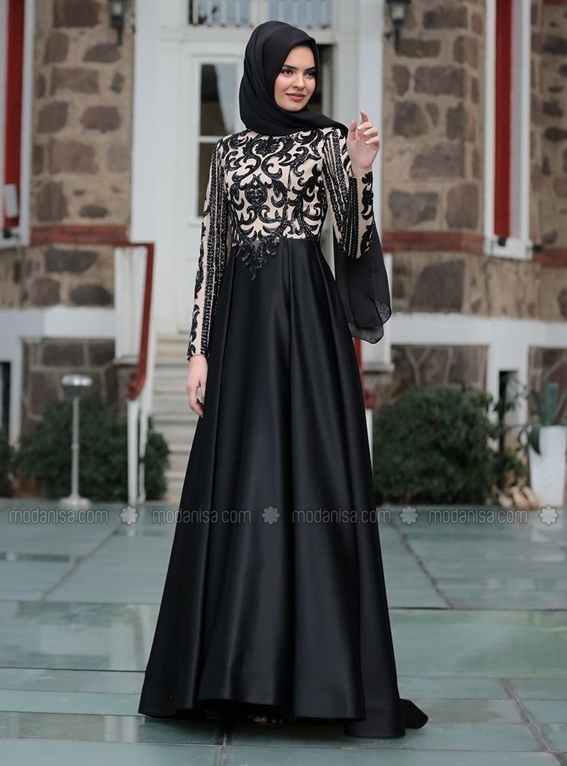 Gaun ini adalah salah satu referensi untuk kamu yang suka memakai pakaian warna hitam. Warna hitam yang didesain dengan kesan yang elegant. Bahan yang dipilih terlihat mengkilat dipadukan dengan brokat berwarna hitam di bagian atas dan warna cream cenderung ke warna kulit. Jilbab yang dipilih pashmina berwarna hitam yang cocok dan serasi banget.