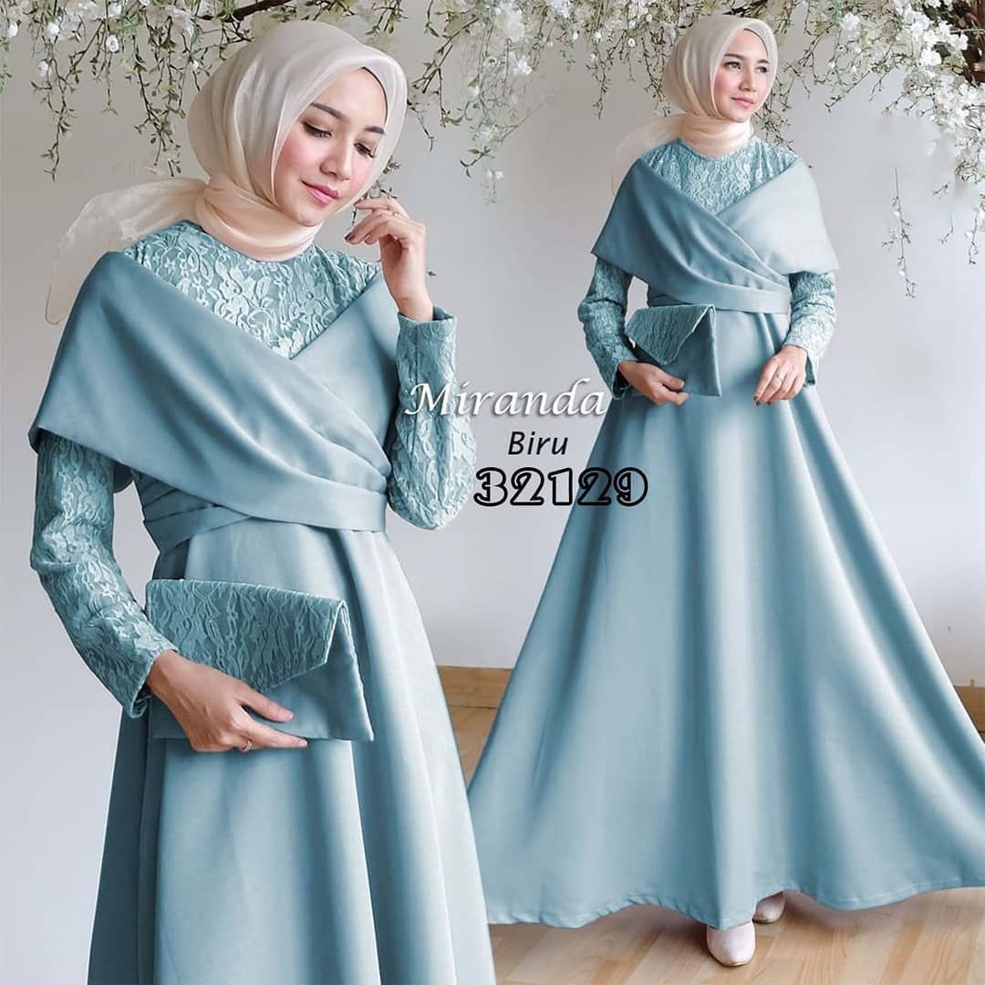 Gaun pesta biru tosca dengan jilbab cream
